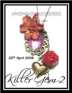 Killer Gem II (SOLD!) I'M PUTTING THIS NECKLACE ON SALE! With the orange flower, its a ONE OFF PIECE, no remakes. Can be used as a brooch or a necklace! (: Pink coloured gem is used. Due to camera flash, theres a slight change in color. Flower charm is unique. And it can be a taken out an used as a brooch. Puffy gold Heart 18k gold charms and anna sui inspired roses are used. It comes in a form of necklace. It will be hunged from behind the flower.